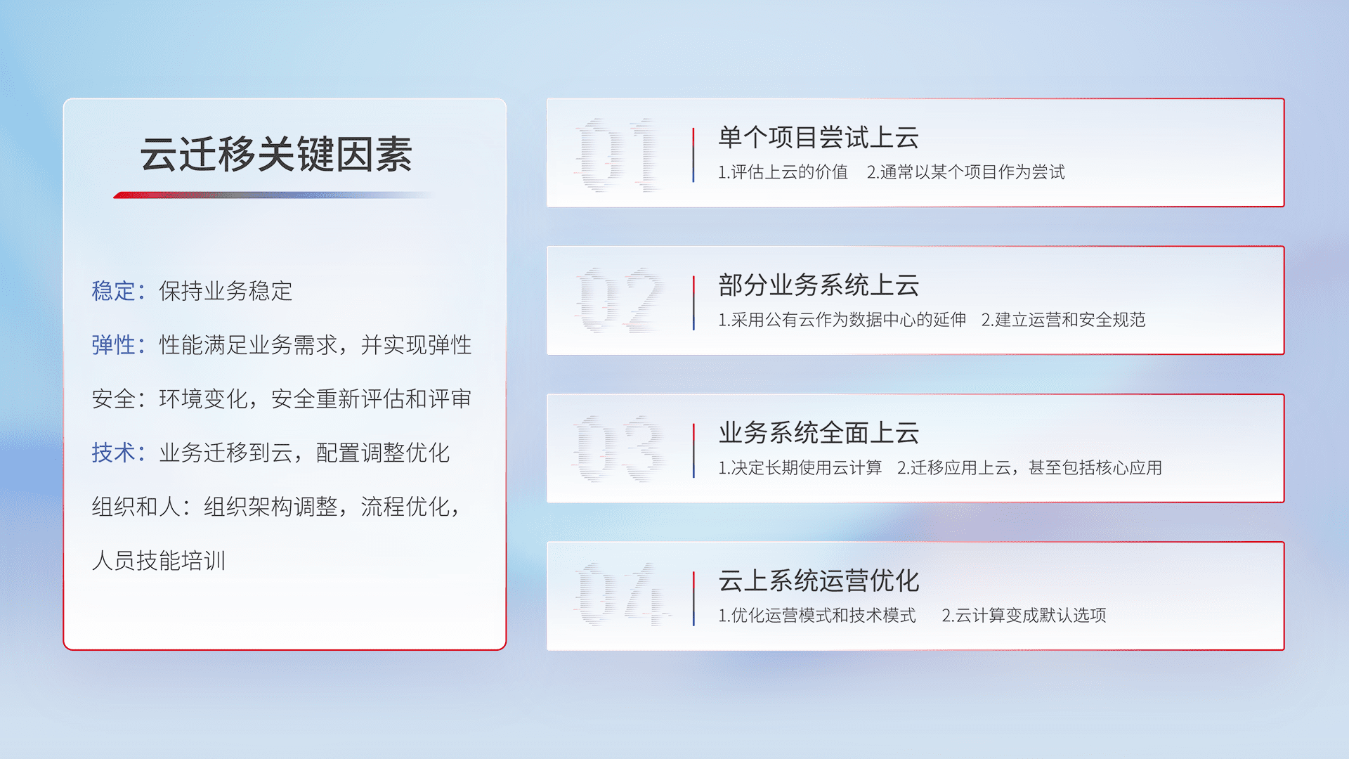 结合实际业务,,,,从规划设计、、云平台选型、、云原生改造、、、、数据迁移、、、、集成交付,,,,迁移全过程为客户识别最佳上云路径,,,,做好风险识别管理,,设计网络架构、、、身份权限、、、、安全审计合规、、、操作审计、、、、日志审计、、、、监控告警策略、、、、多站点容灾设计等,,对云上基础设施进行整体规划,,,提升IT治理水平,,以满足弹性、、、高可用、、高性能的需求。。。