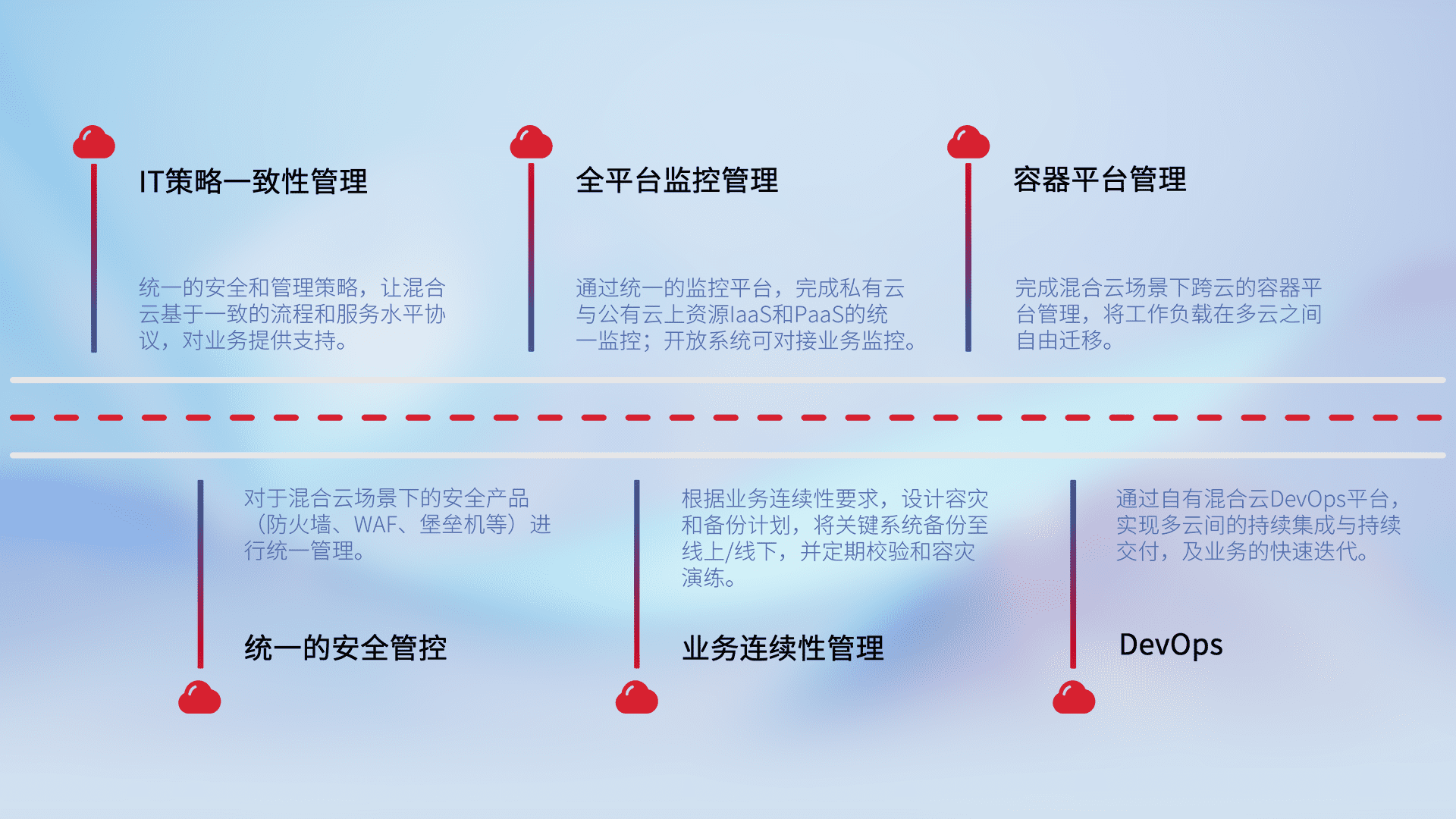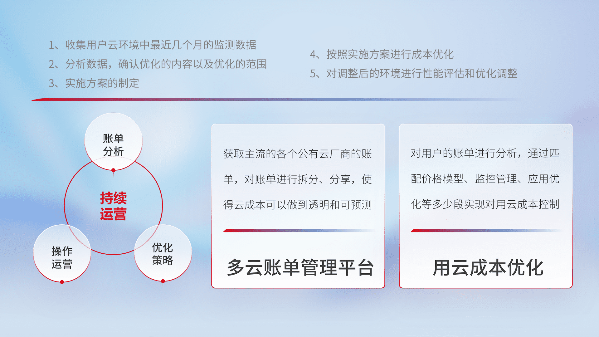 通过多云纳管,,以统一的资源数据模型把客户的云资源进行抽象和封装,,进而实现对多云资源的统一操作,,,保障云资源管理的可靠性、、、稳定性与可用性。。。量身定制化运维内容,,,,配置、、、、开发运维、、、补丁管理、、备份、、、、监控、、、认证和访问管理、、、、审计和日常巡检等,,,,保障在用云过程中的可靠度,,稳定度以及高可用率。。