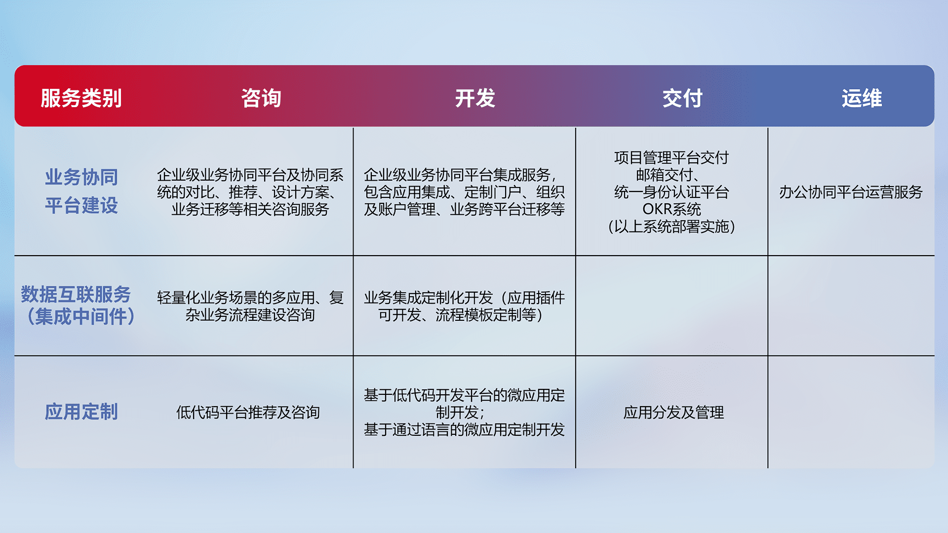 针对钉钉、、、、企微、、、IDaas等平台级产品提供产品的规划、、方案、、交付、、、、定制化开发等服务,,,,实现如统一协同办公、、、智能客户服务、、、、混合会议管理、、、、智能数据查询、、等业务场景,,,,实现数字化转型。。。